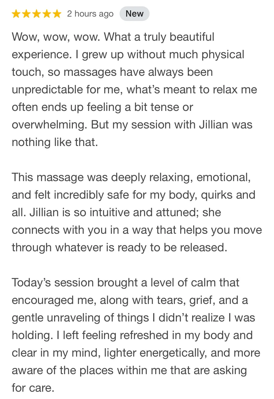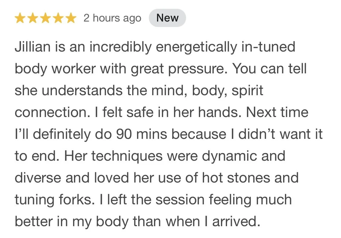 “Jillian creates such a nurturing and safe space. She has an incredible ability to sense exactly where to focus, applying the perfect pressure, guiding your breath, and offering cues that deepen the entire experience.”